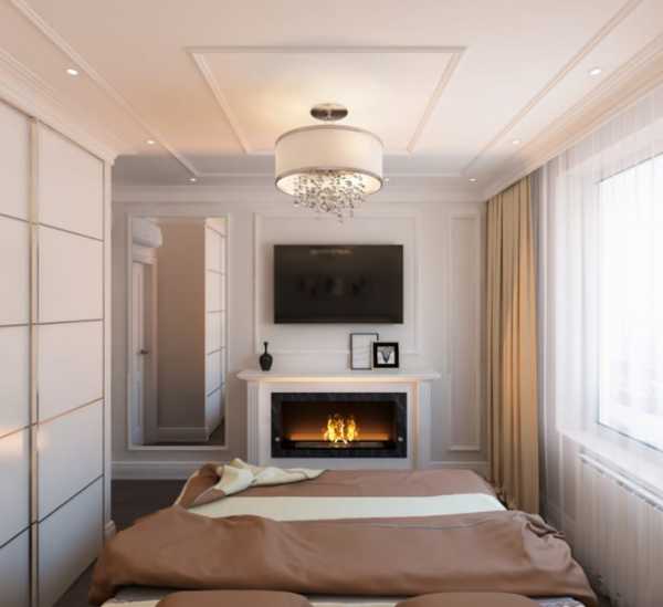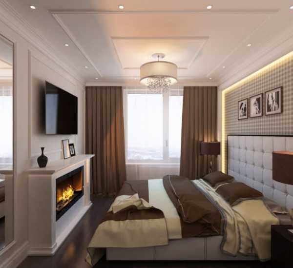 Спальная комната впечатляет красивым рельефом потолка, оригинальным декором на стене с подсветкой и био-камином, помогающим создать романтичную обстановку. Меблировка включает интерьерную кровать с высоким изголовьем и шкаф-купе для хранения вещей.