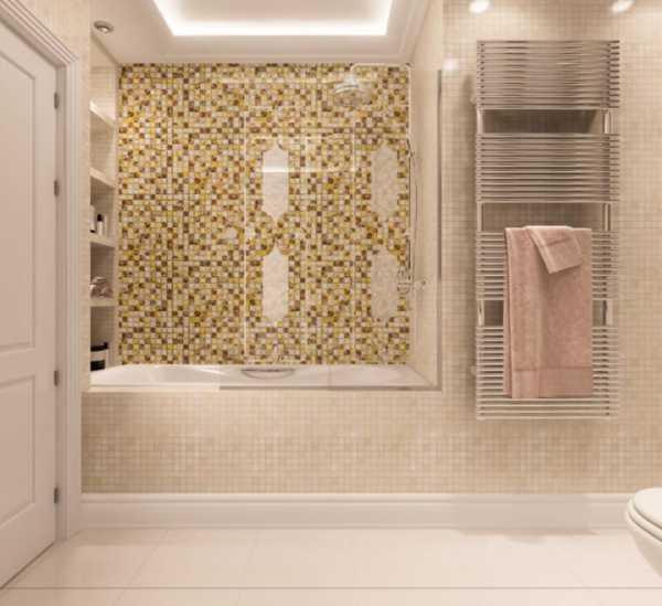 Стильный вид комнате придает отделка мелкой мозаичной плиткой бежевого, коричневого, желтого оттенков. Ванная установлена в нишу с полками для аксессуаров и отделена прозрачным экраном.