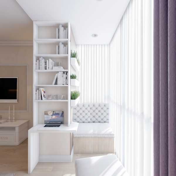 С практической стороны роль зонирования выполняет стеклянная раздвижная перегородка с белым алюминиевым каркасом и матово-бежевым стеклом. Такое решение позволяет отделить кухню от гостиной, но сохранить прозрачность и лёгкость светлого интерьера. Диван в гостиной выбран светло-серого цвета с ненавязчивым геометрическим принтом в скандинавском стиле. Декоративные подушки повторяют ключевые оттенки интерьера: бежевый, серый и лавандовый, но ярким пятном дизайнеры добавили ещё и тёмно-бордовый, чем придали мягкому интерьеру характер. Ковёр перед диваном с природной фактурой, имитирующей песчаник с древесным рисунком, находится на пике интерьерной моды. На нём расположен светлый серо-бежевый пуф с зоной хранения. Стена над диваном декорирована постером с цветочным сюжетом. Напротив расположен низкий комод в стиле кухонной мебели и крупный настенный телевизор в белой раме. Стена декорирована плинтусами и вставками тёпло-бежевых обоев. В центре интерьерной композиции расположена хрустальная классическая люстра, подобраны похожие настенные светильники. Пространство увеличено за счёт утеплённой лоджии, в которой организовано рабочее место, высокое бежевое кресло в классическом стиле осуществляет меблированное зонирование пространства. Зона отдыха в лоджии организована светло-серой софой со скрытой зоной хранения. Цветовым акцентом являются атласные лавандовые шторы.