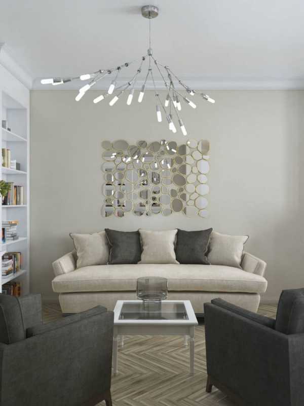 Главную скрипку в интерьере гостиной тоже играют зеркала. На этот раз не мутные, а традиционные. Межкомнатная дверь с зеркальными вставками добавляет пространству перспективы и света. Сердце комнаты — выразительное настенное пано, собранное из небольших зеркал в золотой оправе.