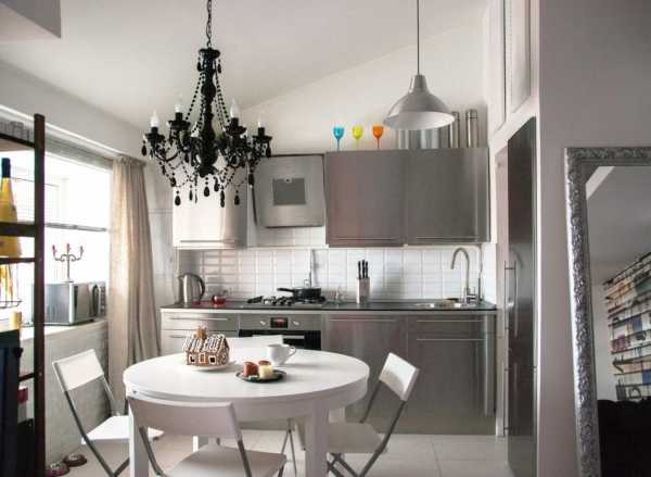 Маленькая кухня в американском стиле, в интерьер которой гармонично вписались встроенные, шкафы, крупный стол и люстры.