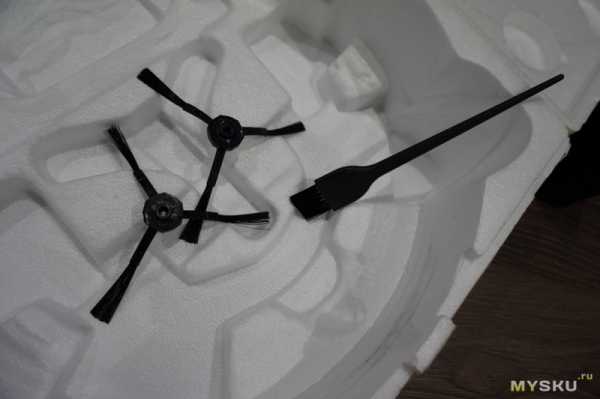 В комплект входит пылесос с резервуаром для воды, две тряпки из микрофибры, моющийся контейнер для сбора пыли, пульт дистанционного управления, база для подзарядки, виртуальная стена, блок питания, кисточка для очистки робота пылесоса от пыли, запасные щётки и запасной фильтр, руководство пользователя( на английском).