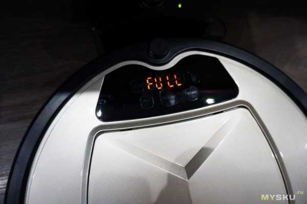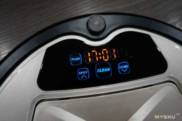 Имеется дисплей с сенсорными кнопками. Отображаются ошибки, кнопки-индикаторы режимов работы (авто уборка, пятно, домой на базу), индикация заполненного контейнера, настройка времени работы по расписанию. Каждое нажатие сопровождается звуками, в том числе голосовыми, вроде «зарядка началась» или «пожалуйста выберите режим» и тд — на английском, естественно.