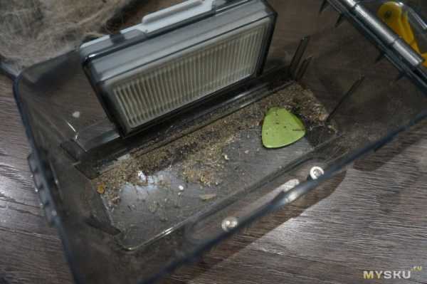 Конечно же не терпелось его включить и проверить в работе. Поездив всего минут 10 по участку на фото, я выключит робота и вытащил контейнер, чтобы удостовериться что это вообще работает. Результат меня очень удивил, даже порадовал.