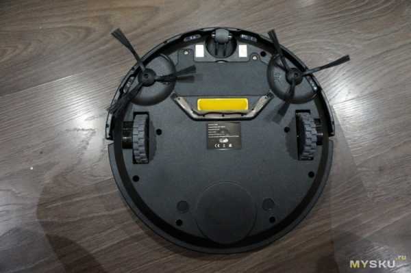 На задней стороне двухсторонний скотч, для лучшей устойчивости. Его пока не отрывал, т.к. не определился с местом. Без этого скотча робот при заезде двигает базу. На фото видно, как часть базу поднимается. Из-за этого пару раз не очень удачно получалось парковаться. Но отмечу что пылесос не просил помощи, не безмолвно затихал — он уверенно сдавал назад, и пытался поймать контакты снова с чуть бОльшей силой и уверенностью, что всегда успешно удавалось. Зарядка длится 3-3,5 часа. Время работы 2 часа, по замеру.