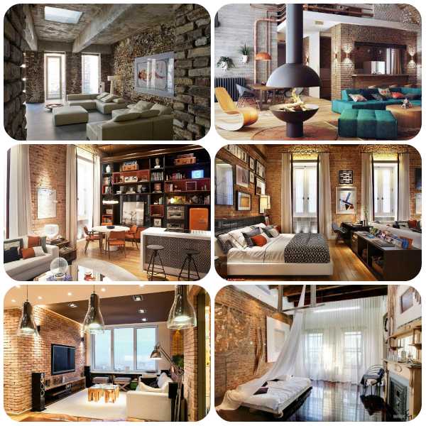 Стиль лофт в интерьере гостиной – это сочетание кирпичной кладки с висящей на стене современной «плазмой», натурального, практически необработанного напольного покрытия и мягкого современного ковра и т.д.