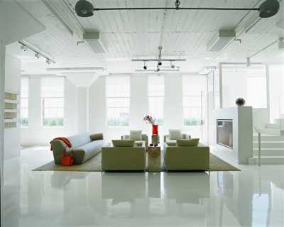 Пол в лофт интерьере наливной или же грубый дощатый, покрытый белым, серым или черным лаком.
