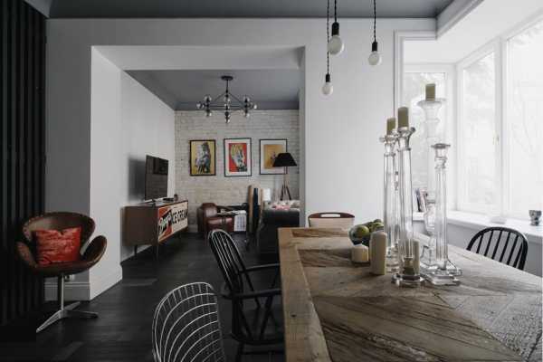 В квартире же их можно создать самим, а сам потолок выкрасить в светлый тон. Кстати, хорошим решением будет многоуровневый потолок, который не выбьется из общей стилистики, но еще и послужит инструментом зонирования. Что касается материалов, то тут можно провозгласить эклектику: металл, дерево, пластик, стекло, ковка…