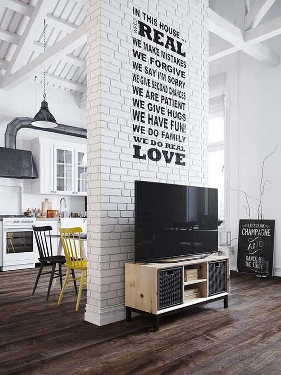 — Кирпич, декоративный кирпич. Кладка из этого материала – любимый прием дизайнеров, создающих стильные лофты. Имитация кирпича создается при помощи обоев, краски.