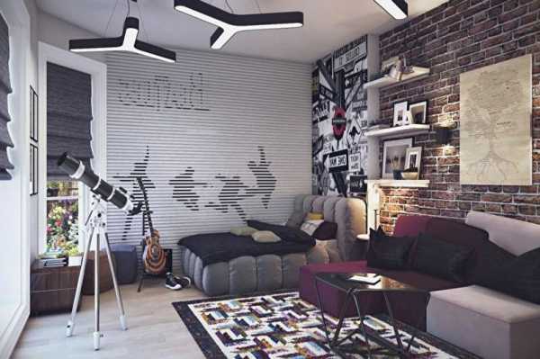 Молодежные предпочтения выдерживаются в соответствии со всеми составляющими стиля. Мальчишкам это точно понравится. Кирпичная кладка так здорово смотрится рядом с любимой гитарой, а цвет стен оттеняет любимый синий плед.