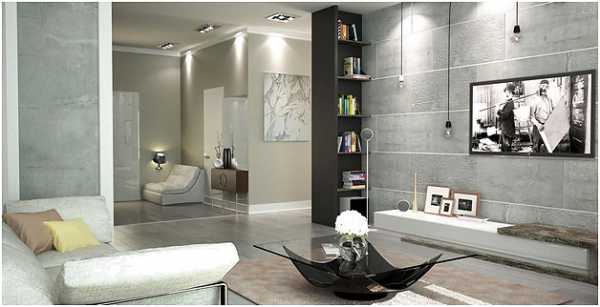 - Бетон. Необработанный или покрытый штукатуркой натуральных серых оттенков.