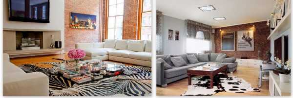 - В качестве покрытия на пол постелите натуральные шкуры, цветные коврики. И то, они выглядят небольшим пятном на огромном пространстве. Ими делают акцент, привлекая внимание к определенной зоне.
