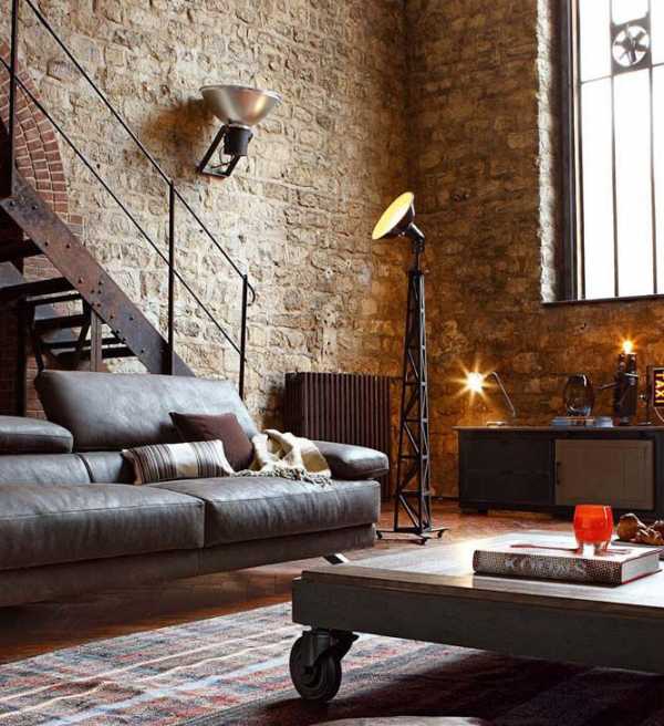 Это интересно! Главный секрет применения напольных светильников в стиле лофт – их необычная форма и размер. Торшер должен быть выше человеческого роста, при этом прочно стоять на подставке. Приветствуются креативные конструкции, например, в виде прожектора фотостудии или железнодорожного фонаря.
