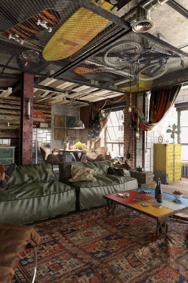 Цветовая палитра контрастная, от темно-коричневых до ярких оттенков, самое главное — все хорошо сочетается. В этом лофте много креативных решений используемых для декора. Стены выполнены из кирпича различных оттенков и светлого дерева. Потолок ошеломляет — он сделан из поддонов и металлической сетки, предназначенной для хранения спортивного оборудования, которым владеет хозяин. В интерьере много дерева, кожи и металла. Большой диван выполняет роль зонирования помещения. Огромное количество состаренных табличек, произведений искусства и индустриальных ламп добавляют изюминку в декор этого лофта.