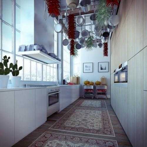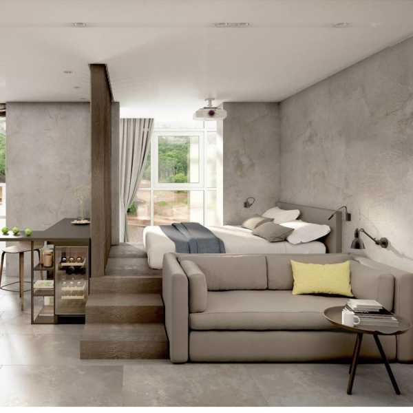 Пол в кухне выделите за счет плитки. Зона гостиной может быть решена большими диванами и креслами. В гостиной может быть крупное графическое и цветовое решение ковра, леопардовая шкура, шкура зебры или локальное пятно из фетра и войлока, которая играет роль оптического эффекта, четко зонирующего территорию гостиной. Спальная зона может быть отгорожена одной стенкой.