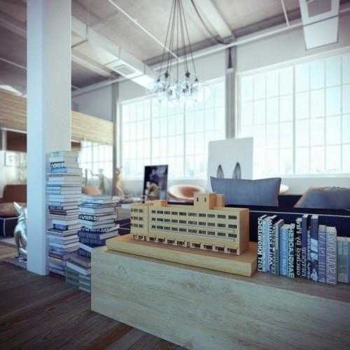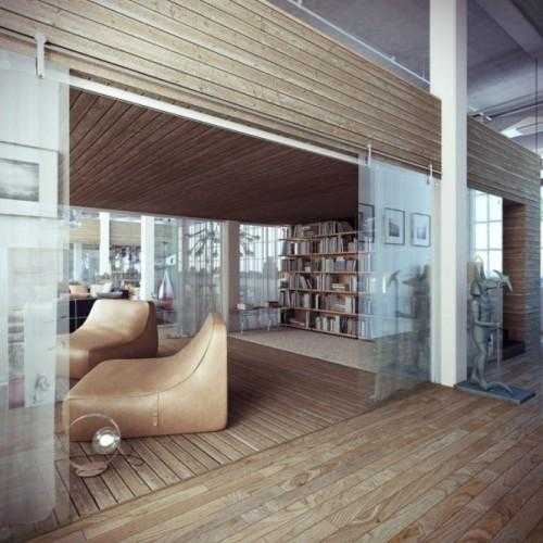 Они должны были создать жилой лофт, где отражались движение и непрерывность. Пространство комнат должно быть заполнено большим количеством книг, фотографий и произведений искусства. Для освещения используются большие окна. Материалы, которые используются в интерьере это дерево, серебряный металл, стекло и кожа, а вернее кожаная мебель. Цветовая гамма интерьера состояла из приглушенных коричневых и синих тонов. Все это делает из промышленного чердака стильный лофт для современной и творческой личности.