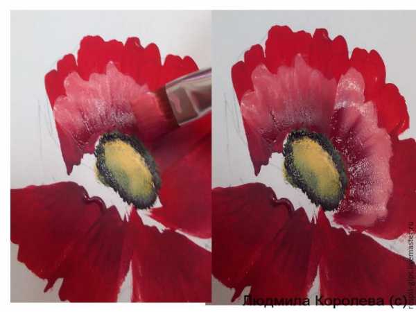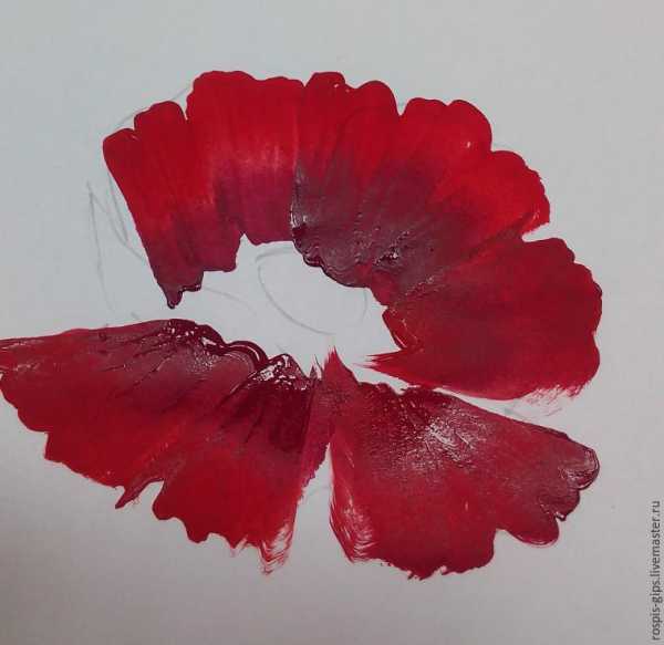 Далее рисуем нижние внутренние лепестки, также, как мы рисовали верхние внутренние, помешивая белила к светлой красной краске.