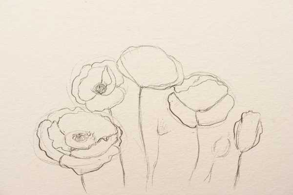 Первым делом рисуем эскиз. Намечаем основные линии, цветки маков, стебли: