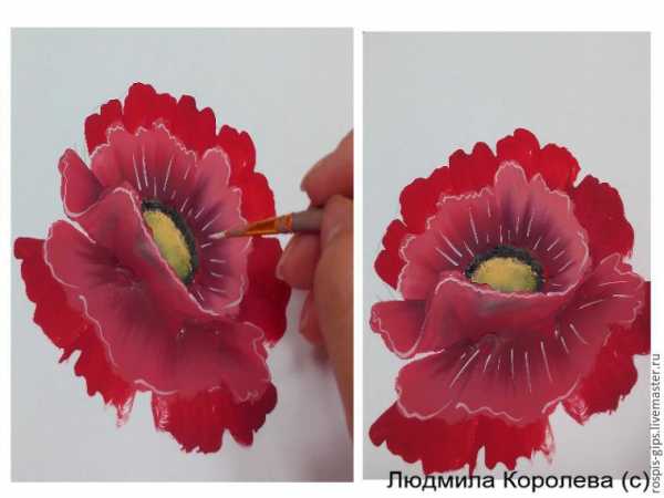 Займемся детализацие цветка. В белила добавляем капельку красной краски. Тонкой кисточкой слегка обводим края внутренних лепестков цветка дрожащим движением руки.