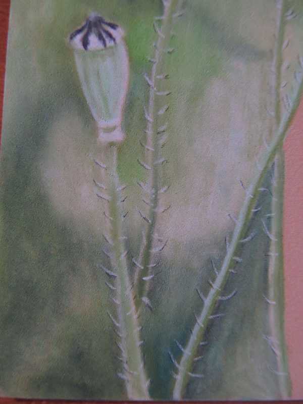 Далее, начинаем работать с коробочками мака. Намечаем форму белым карандашом: