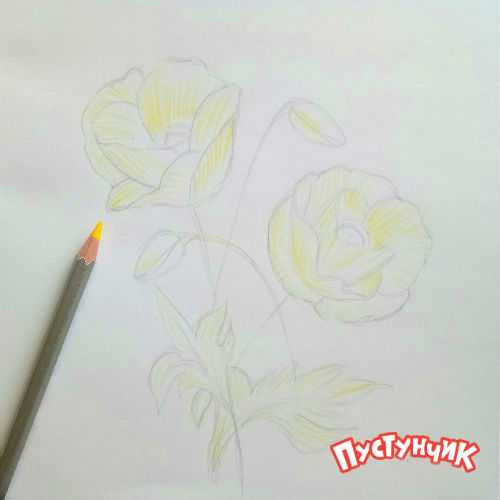 5. Желтым карандашом прорисуй светлые участки на цветах, бутонах и листьях.