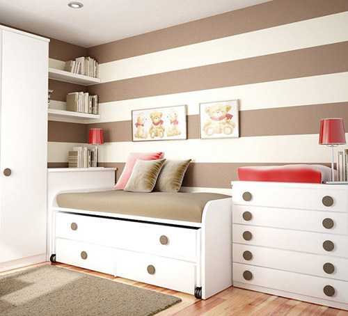 В такой комнате может быть однотонное оформление (характерное для современных проектов) или обои с вертикальными полосами. Но базовые цвета классики — не детские, а более сдержанные, «королевские» — розовый, оливковый, бежевый. Правильно подобранный оттенок расширит маленькое пространство.