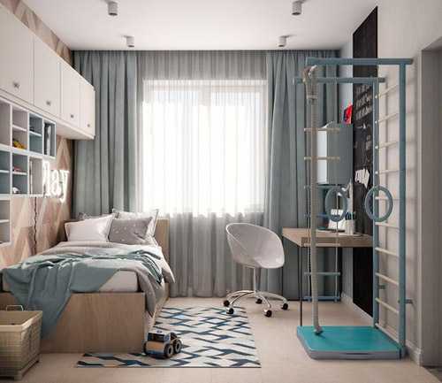 Главное в стилистике — кирпичная или серая стена, загадочные светильники из металла, обилие света. Вся мебель должны быть функциональной и сохранять свободное пространство. На выходе должна получиться практичная комната, идеальная для активных игр и создания мини-мастерской.