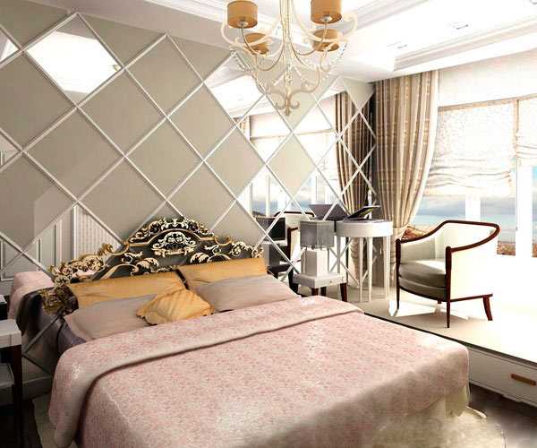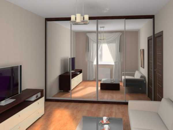 Еще один выгодный прием – размещение зеркал. Это может быть люстра с зеркальными элементами или мебель с отражающими поверхностями. Идеальный вариант – это шкаф-купе на всю стену с зеркальной дверью, или вставками из зеркал. Корпусная меблировка не будет занимать много места, решая проблему размещения вещей и предметов обихода.