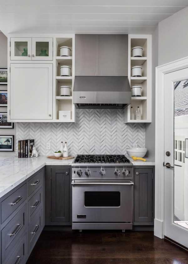 Для экономии пространства обычно советуют заменить шкафчики на открытые полки, однако это не очень рациональное решение. Во-первых, далеко не все бытовые принадлежности обладают эстетичным дизайном, который можно выставить напоказ. Во-вторых, наличие фасадов защищает их от пыли. Правда, свой выбор лучше остановить на шкафах с откидными или подъемными дверцами, а на нижнем уровне вовсе заменить их на выдвижные ящики.