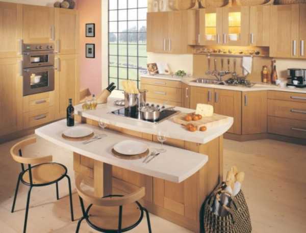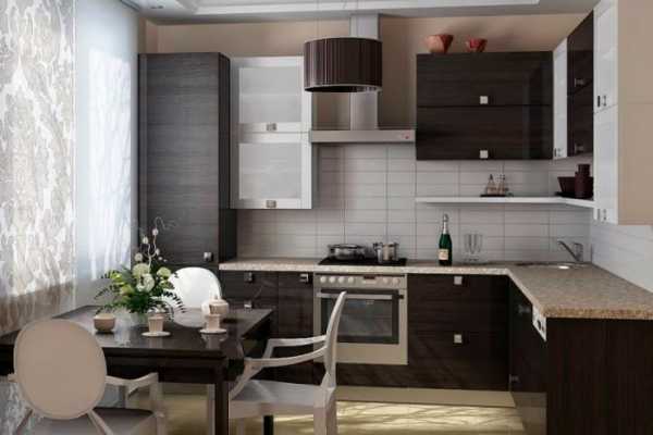 - прекрасным выбором для такой кухни считается установка углового кухонного гарнитура, обеспечивающего оставление довольно большого свободного пространства в одной стороне помещения;