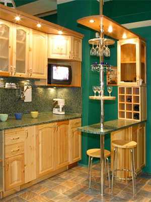 - древесина — мебель для кухни маленького размера, выполненная из натурального дерева, считается наиболее дорогостоящей. Она привлекательна и экологически безопасна. Важно убедиться, что в заводских условиях все элементы были обработаны специальными защитными составами. С целью производства используется лиственница или ель, сосна и дуб, а также береза. Каждый материал обладает своими особенностями;
