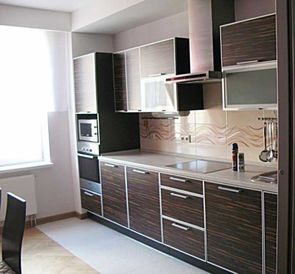 - линейная — выбирается одна стена помещения, вдоль которой будут расставляться отдельные предметы, формирующие полноценный гарнитур. Данный способ подходит обычно для длинных кухонь, но они не должны быть слишком узкими, а иначе в помещении просто не останется места для свободного передвижения. Для проектирования данной планировки учитывается, где будет находиться мойка и плита, причем они не должны быть рядом с холодильником, поэтому между этими элементами непременно устанавливаются напольные тумбы;