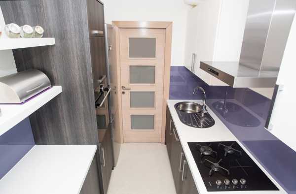Двери в маленькой кухни могут быть раздвижными — для экономии места.