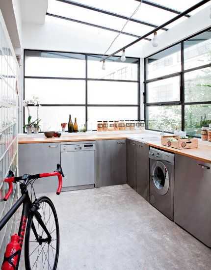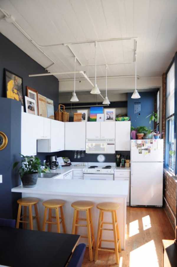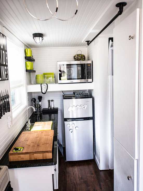 - «Впихнуть» побольше. Максимально использовать высоту помещения, чтобы разместить оборудование, системы хранения, а также небольшое обеденное место. Оригинальные конструктивные решения могут быть не только удобны, но и выразительны. Результат: тесновато, но визуально стильно.
