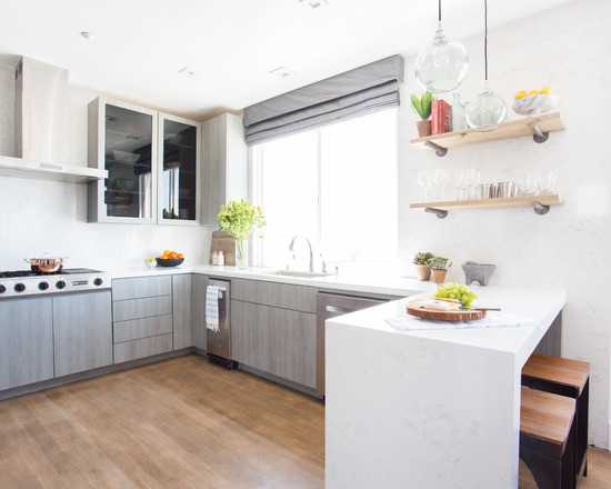 Дизайн малогабаритной кухни, в которой остался только стандартный набор оборудования, обеденная зона и навесные полочки, имеет массу стильных вариантов.