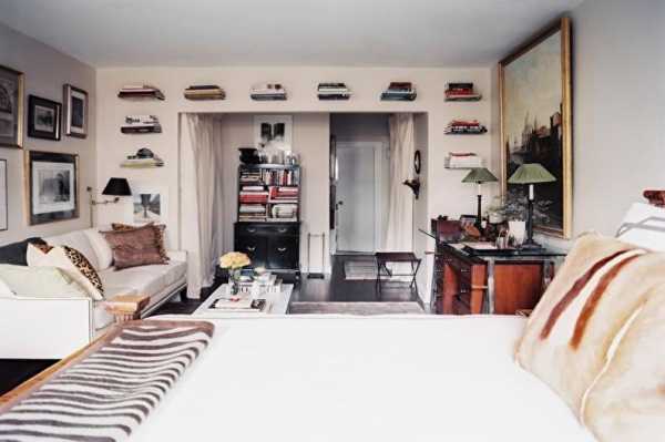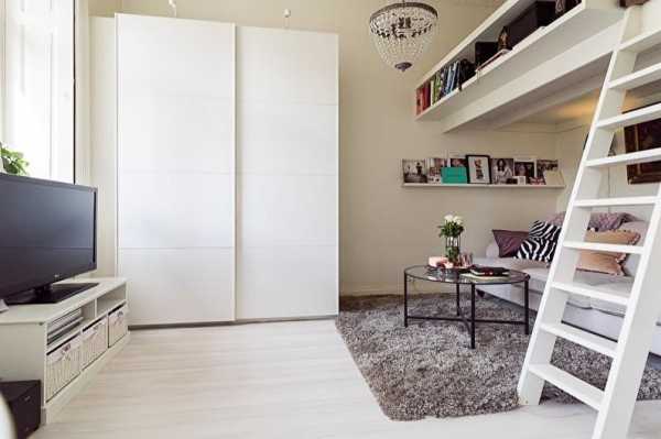 Упорядочить вещи в малогабаритной квартире будет намного проще, если предусмотреть для каждой мелочи отдельную полку. Для этой цели подойдут вместительные шкафы высотой до потолка, всевозможные антресоли, выдвижные ящики (в том числе расположенные под кроватью или внутри подиума). Желательно, чтобы дверцы систем хранения плотно закрывались, причем не распашными створками, а по принципу купе. Стеллажи и открытые полки для маленьких помещений не очень удобны, поскольку оставляют на виду предметы, которые не только накапливают пыль, но и нарушают целостность пространства.