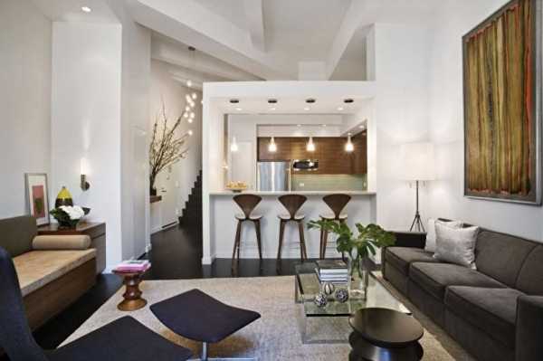 Маленькую кухню можно увеличить за счет объединения ее с гостиной. Здесь есть разные варианты: можно полностью убрать стену между этими комнатами, можно частично. Возможно просто сделать широкую арку вместо входа из одной комнаты в другую.
