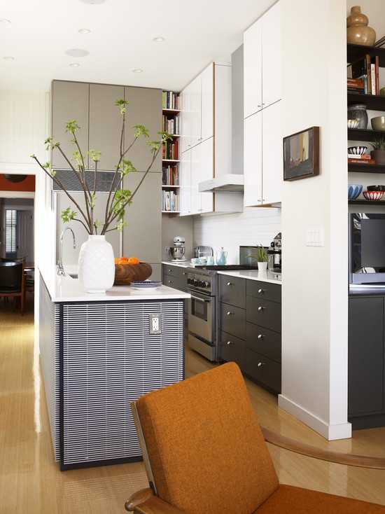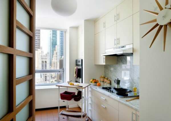 На небольшой кухне не должно быть ничего лишнего, так как это превратит ее в гастрономический хаос. Современные дизайнеры разработали массу вариантов использования небольшого пространство. Например, в узкое пространство между стеной и холодильником прекрасно входит тонкая полочка, выезжающая на колесике. В нее замечательно становятся все предметы этого объема: пачки с крупами, специи, масла, баночки с вареньем и другое, что душе угодно и должно быть постоянно под рукой и при этом может не храниться в холодильнике.
