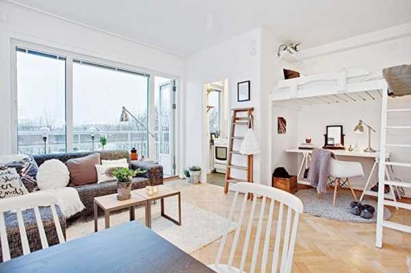 Половое покрытие также визуально делит помещение. А если сделать подиум, то найдется место и для вещей или даже для выдвижной кровати.