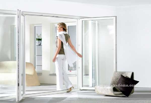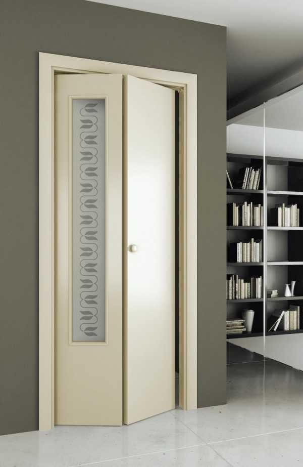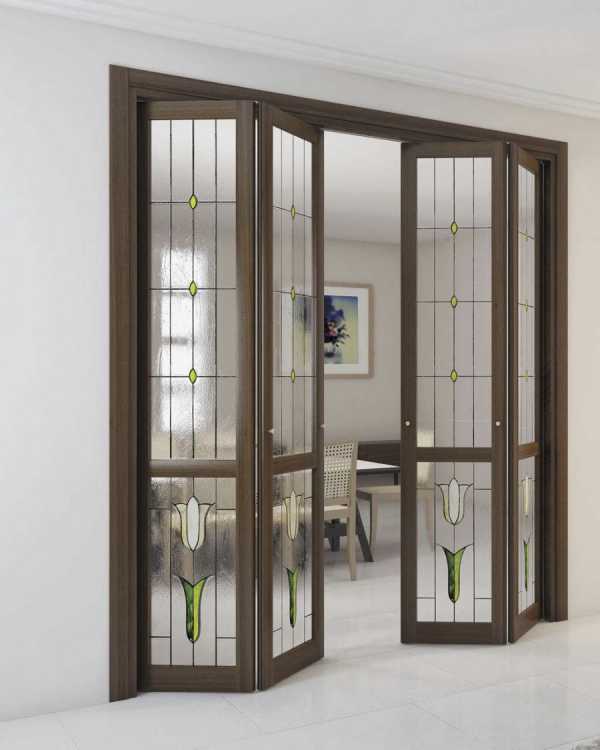 Данный тип конструкции заметно сложнее альтернативных вариантов. Дверь представляет собой гармошку, при открытии складывающуюся. Она не занимают лишнего места, что делает раскладную дверь средним между распашными и раздвижными межкомнатными дверями.