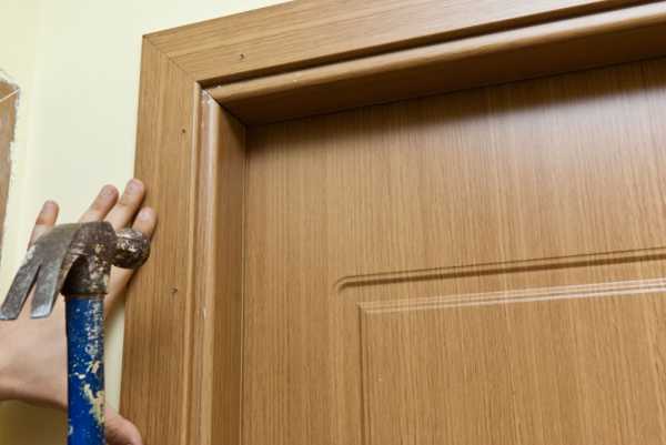 Обрезаем наличники, равняясь на высоту двери, под углом сорок пять градусов, и прибить их к дверному проему с двух сторон гвоздиками маленьких размеров без шляпок, также можно покрасить наличники в тон двери. По итогу готовой работы, просматриваем завершенную работу на предмет дефектов, подкрашиваем нужные места и дверь станет готовой.