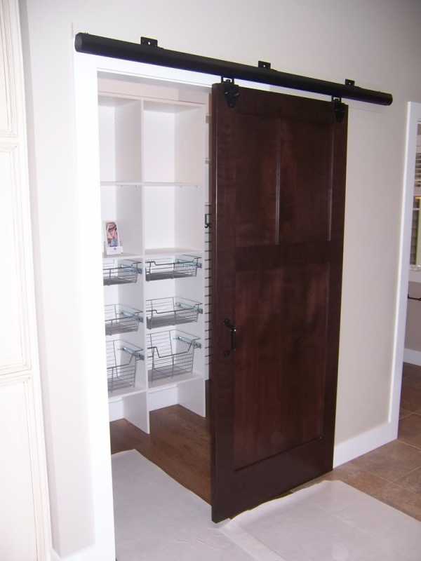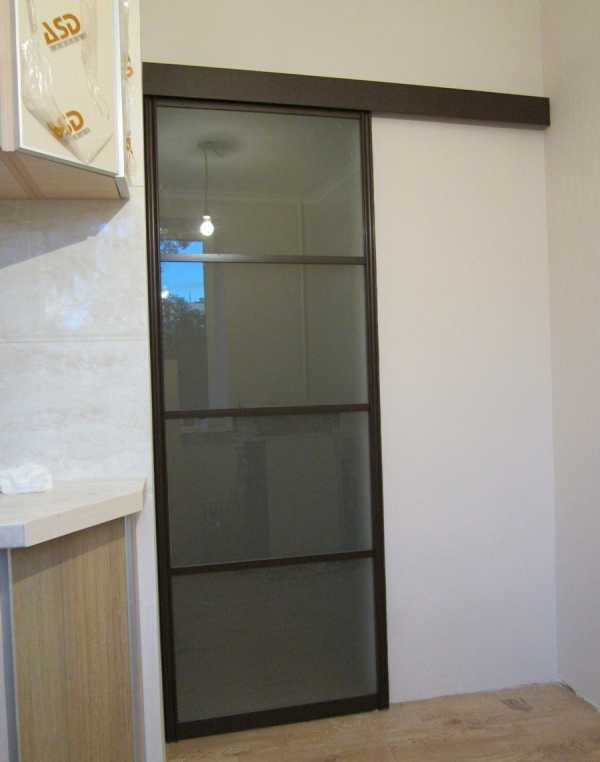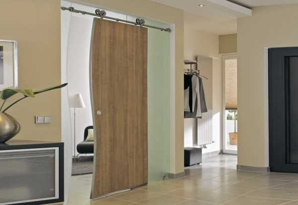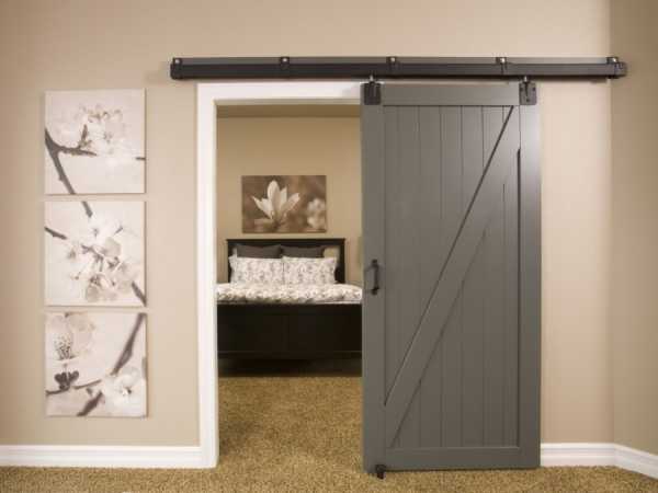 Сама дверь закреплена на рельсе. Какой тип направляющей выбрать – верхний или нижний – дело личного удобства. Использование сразу обоих позволяет повысить надежность конструкции. Только верхний привлекает отсутствием порога. Решить проблему можно, просто утопив нижнюю рельсу в пол.