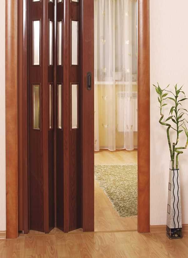 Гармошка со стекломИзготавливаются двери-гармошки из различных материалов. Для облегчения веса конструкции используют вставки из стекла или ткани. К достоинствам таких конструкций относят простоту эксплуатации, экономию пространства и низкую цену. Недостаток – плохая звукоизоляция. Гармошка станет идеальным элементом декора для любого помещения, главное выбрать необходимый цвет и структуру.