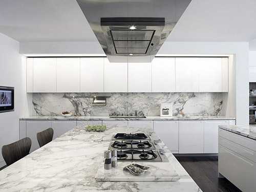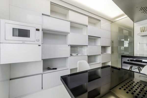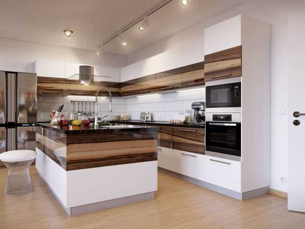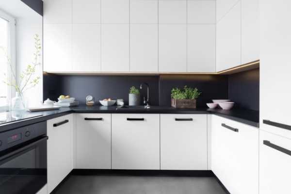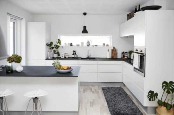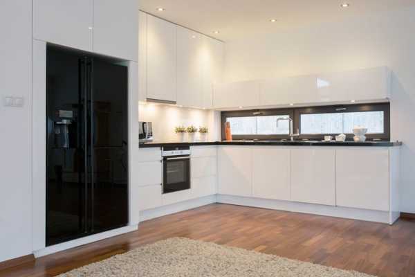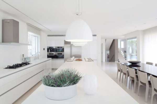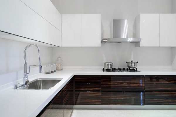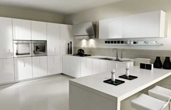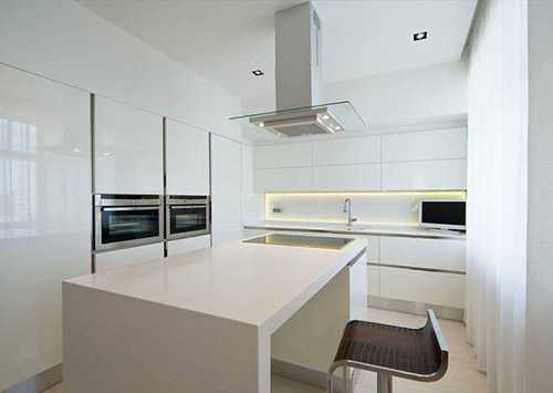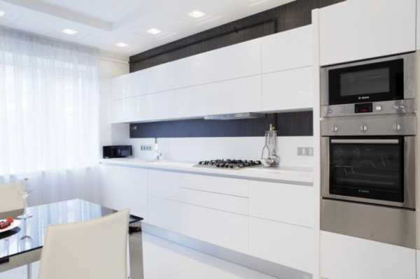 Белоснежный цвет — смелое и оригинальное решение для оформления кухни.Еще одно традиционное сочетание – черный и белый. Такая кухня выгодно будет смотреться в большом помещение, а если места недостаточно, черный лучше использовать в виде деталей.