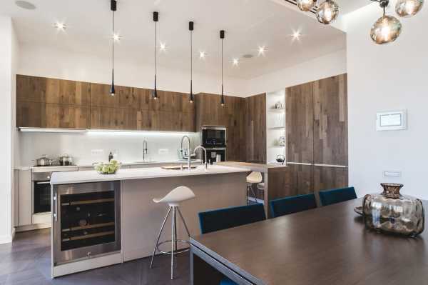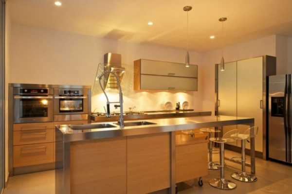 Обильный рассеянный свет зрительно расширяет стены и объединяет зоны кухни. Но для того, чтобы достичь такого эффекта, комбинируются разные способы локальной подсветки: