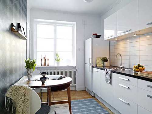 Для маленьких габаритов необходим проект максимально функциональной мебели, которая визуально растворяется в пространстве. Он создает оптимальное количество рабочих поверхностей и прячет в себя бытовую технику. В этом случае все необходимое в зоне досягаемости, но на кухне царит идеальный порядок.