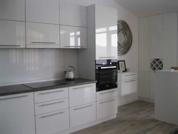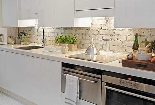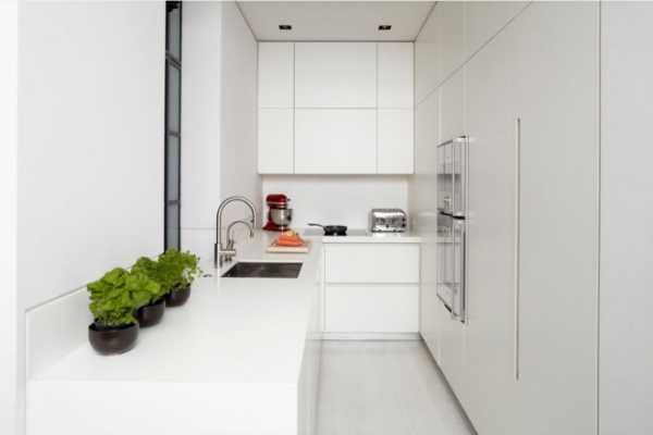 Полностью белая кухня — очень нежное и аккуратное сочетание, классика минимализма. Рабочая зона кухни, оформленная в такой гамме, выглядит просторной, воздушной и дорогой, но требует поддержания порядка и небольших ярких аксессуаров.