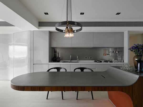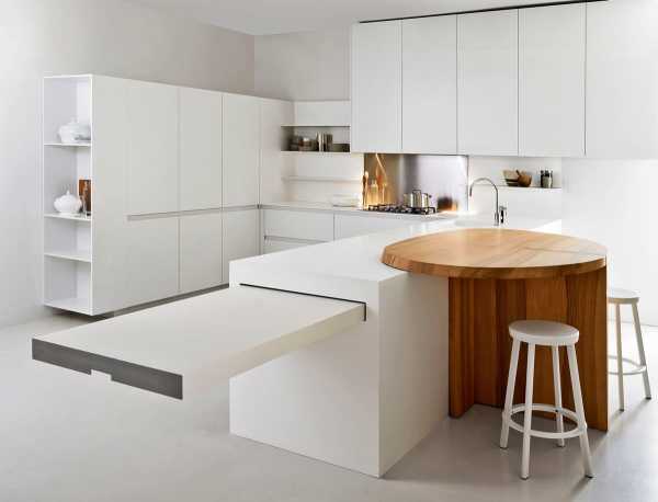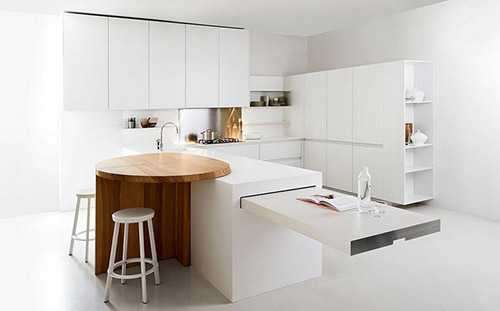 Функциональная мебель обеспечивает полный порядок на кухне.Минимализм в просторных помещениях не означает абсолютный отказ от чего-то привычного. Это, прежде всего, правильное зонирование пространства, которое может обеспечить барная стойка или обеденный стол. Возможно объединение этих двух предметов с сохранением функциональной нагрузки.
