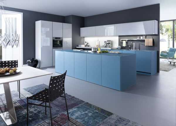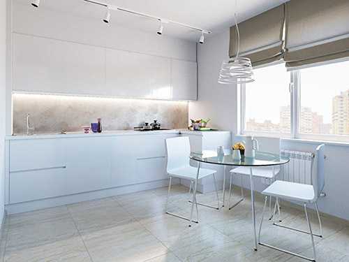 Глянцевые фасады на кухне создают дополнительное пространство.Еще одна важная характеристика – много света. В помещении, где сложно на чем-то сфокусировать внимание, на первый план выходит освещение. Его должно быть очень много. Большие окна не прячутся за занавесками, используются стеклянные перегородки и локальная подсветка.