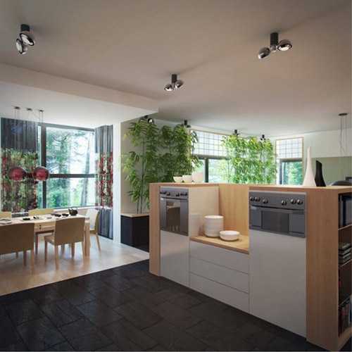 Зонирование также можно выполнять не стенами, а кухонным гарнитуром, что по сути, окажется кухонным островком, на котором можно разместить все нужные хозяйке инструменты.